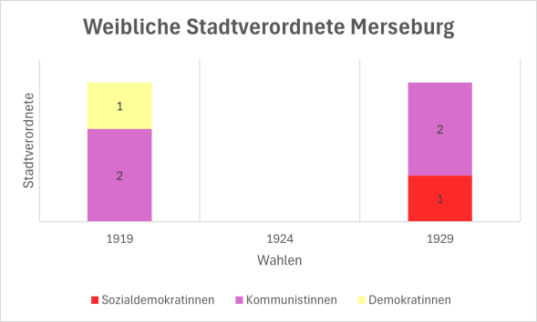 Zur ersten Stadtverordnetenwahl am 2. März 1919 kandidierten zwölf Frauen auf fünf verschiedenen Listen. Zunächst erhielten drei ein Mandat; Magda Hoppstock und Frieda Koenen für die Unabhängige Sozialdemokratische Partei (USPD), die sich in Merseburg 1920 der Kommunistischen Partei (KPD) anschloss, und Anna Krieghoff für die Deutsche Demokratische Partei (DDP). Alle legten jedoch verfrüht ihr Mandat nieder. Im November 1919 rückte Lilli Haacke für die Deutschnationale Volkspartei (DNVP) ins Stadtparlament nach, Ida Scharch für die Sozialdemokratische Partei (SPD) im März 1920. Das Stadtparlament setzte sich aus 13 sozialistisch gesinnten USPD-Stadtverordneten, und 13 Demokrat:innen der DDP sowie 6 Nationalkonservative der DNVP und 3 Sozialdemokrat:innen zusammen. Ein Sitz ging außerdem an die Liste Mueller, die vermutlich auch dem bürgerlichen Spektrum angehörte. Der Frauenanteil nach Direktwahl (3 von 38 Sitzen) betrug etwa 8 Prozent.