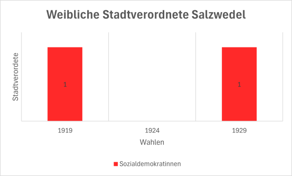 Bei der Wahl am 12. März 1933 wurden keine Frauen mehr in das Salzwedeler Stadtparlament gewählt. Die NSDAP erhielt mit zehn Sitzen die meisten. Es folgte die SPD mit sieben und die Vereinigte Bürgerliste „Sparsamkeit und Ordnung“ mit sechs Sitzen. Die restlichen Mandate verteilten sich auf die KPD, die Liste „Beamte, Angestellte und Verbraucher“ und die Liste „Nationale Beamte, Pensionäre, Kleinbürger und Rentner“ mit jeweils einem Sitz.